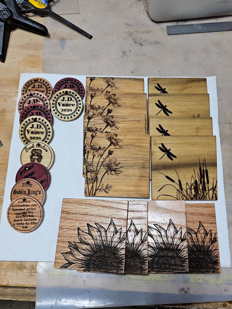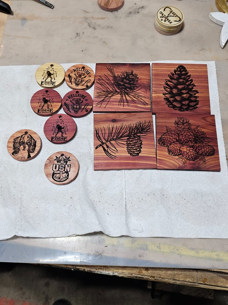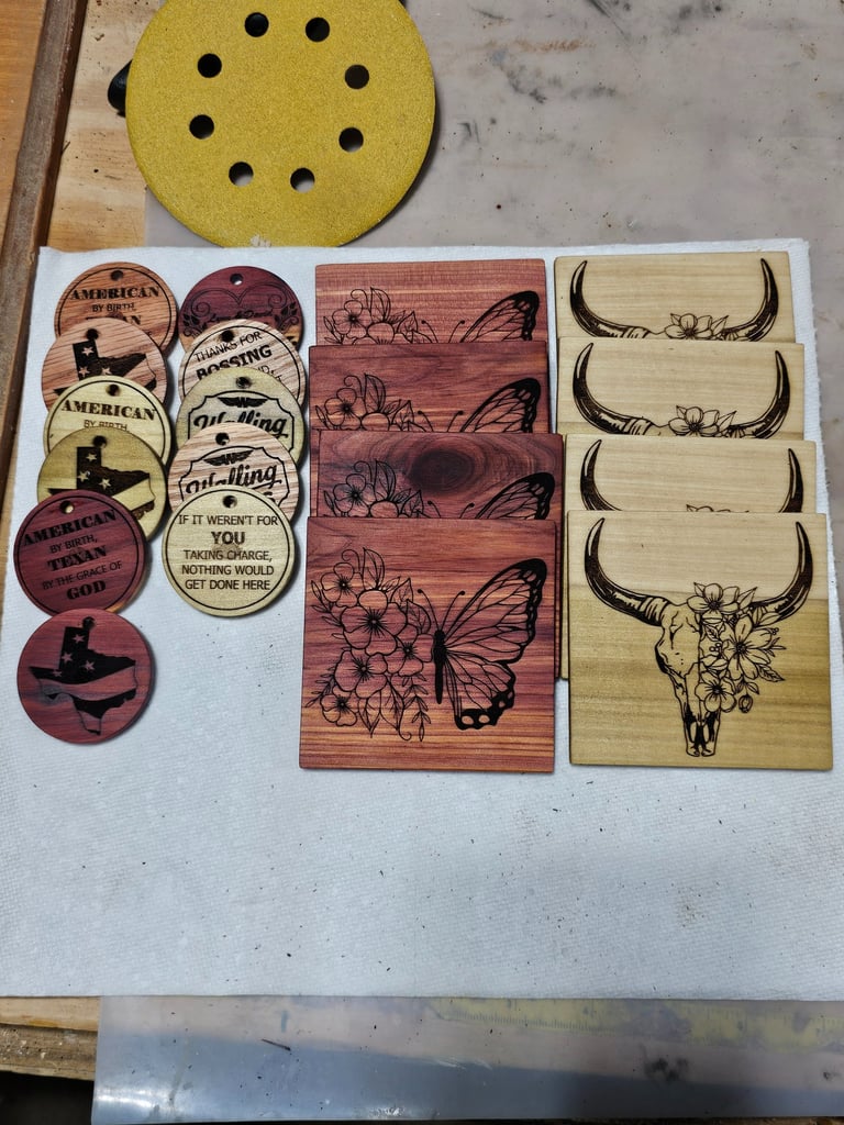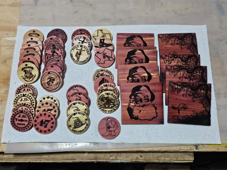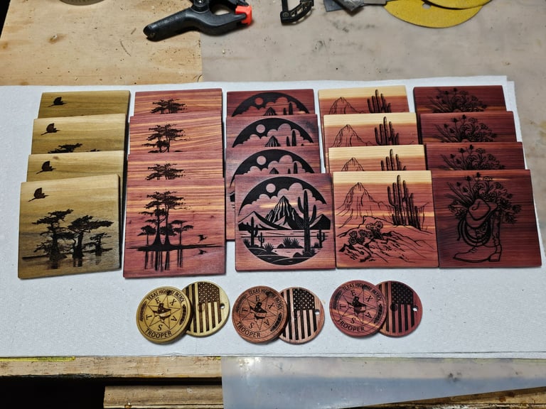 Unique custom wood crafts made with layers of beautiful wood. Coasters, Wine Caddies, Custom Engraved Bottle Openers and more.